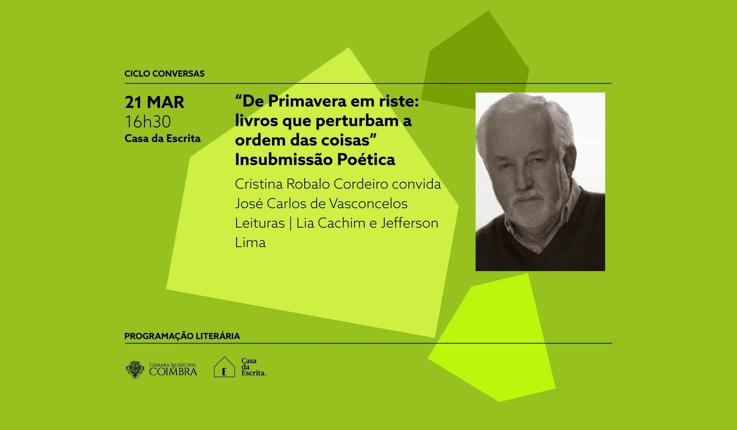 No próximo sábado, dia 21 de março, às 16h30, Casa da Escrita recebe José Carlos de Vasconcelos. O escritor e jornalista é o convidado de Cristina Robalo Cordeiro, no âmbito do ciclo “De Primavera em riste: livros que perturbam a ordem das coisas”, inserido no eixo “Programação Literária”, que preenche a nova programação da Casa da Escrita. Dedicada ao tema “Insubmissão poética”, esta primeira sessão do ciclo tem como mote a obra integrada na coletânea “De poema em riste”, publicada em 1970, que fez de José Carlos de Vasconcelos um autor vanguardista e um contestatário declarado do regime salazarista. A iniciativa vai contar, ainda, com leituras de poesia, por Lia Chacim e Jefferson Lima.