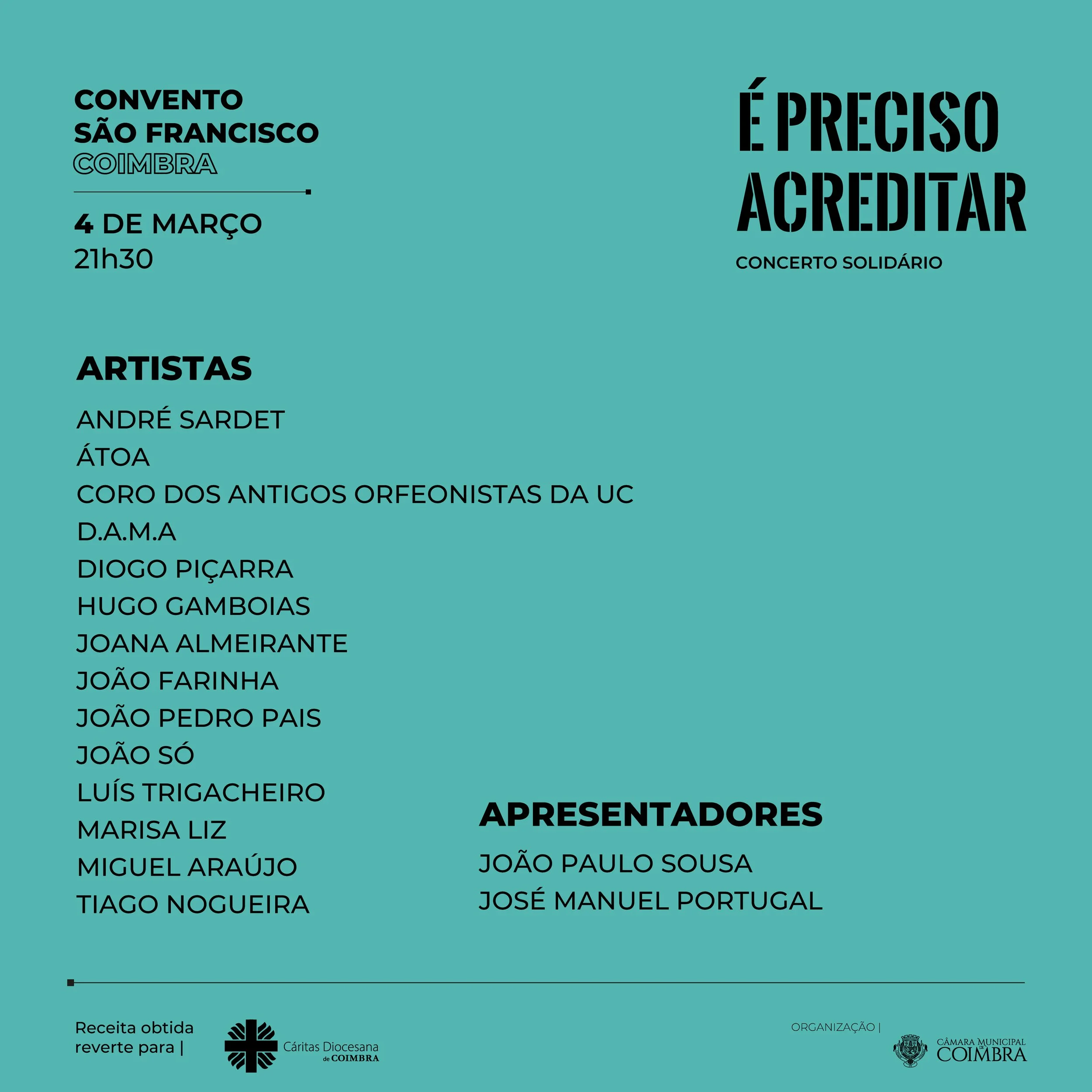 “É Preciso Acreditar” nasce da sugestão e da disponibilidade manifestada por um conjunto de artistas de âmbito nacional que, de forma voluntária, se associaram a esta causa solidária, colocando a sua arte ao serviço da comunidade. O concerto reúne em palco André Sardet, ÁTOA, Coro dos Antigos Orfeonistas da Universidade de Coimbra, D.A.M.A, Diogo Piçarra, Hugo Gamboias, João Farinha, João Pedro Pais, Luís Trigacheiro, Marisa Liz e Miguel Araújo numa noite que se pretende de união, esperança e ação concreta. A este elenco vão ainda juntar-se novos artistas.