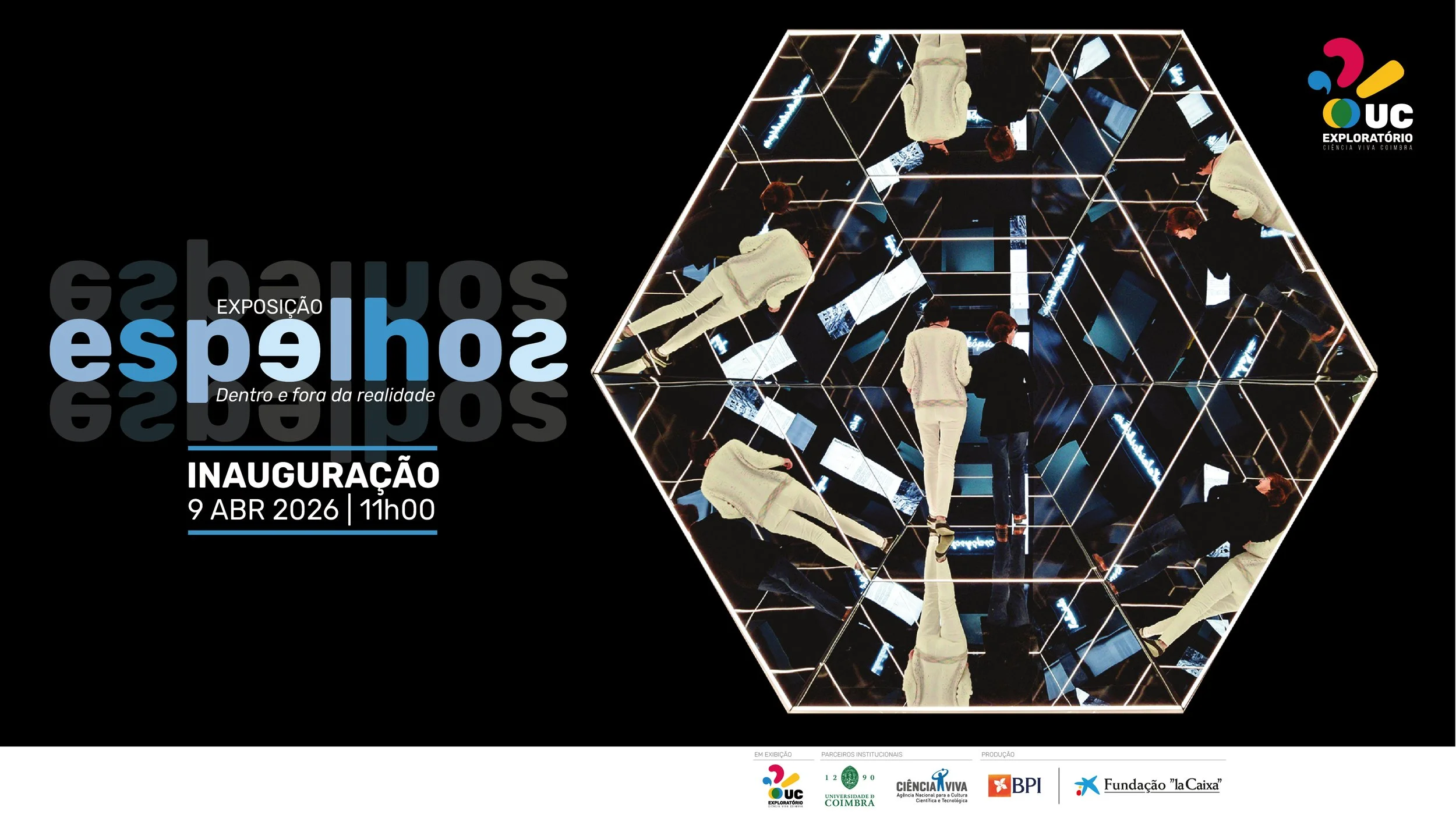 Espelhos - Dentro e fora da realidade é a nova exposição central do UC Exploratório - Centro Ciência Viva da Universidade de Coimbra, que estará aberta ao público a partir desta quinta-feira, dia 26 de março de 2026, de novo no âmbito do acordo global de colaboração estabelecido com a Fundação ”la Caixa” | BPI.